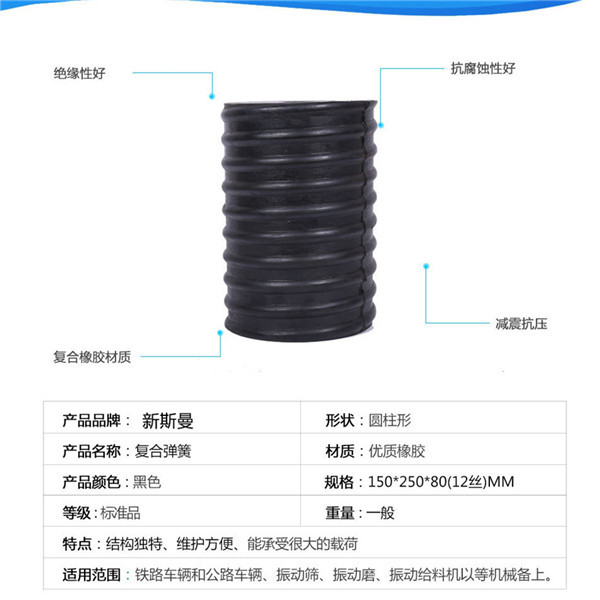 復(fù)合彈簧:是由金屬螺旋彈簧和橡膠復(fù)合在一起的園筒狀彈性體。該產(chǎn)品優(yōu)于金屬彈簧,具有抗腐蝕性好、壽命長等優(yōu)點(diǎn),與其它彈簧相比,減振能力強(qiáng),緩沖效果好。