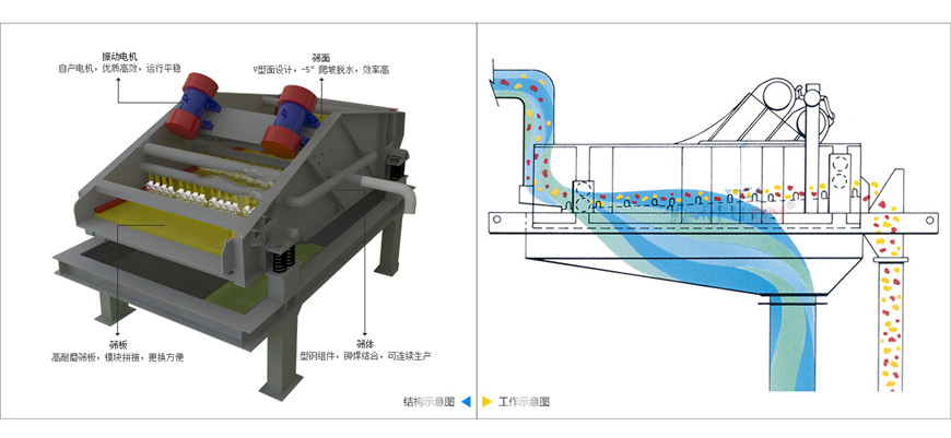 脫水篩又稱高頻脫水篩,通過(guò)激振力改變了礦漿表面的水張力,漿水透過(guò)篩網(wǎng)成為篩下物,而微細(xì)物料被篩網(wǎng)阻隔形成濾層受振動(dòng)力影響向前運(yùn)動(dòng)排出。脫水篩主要用于選礦行業(yè)的尾礦脫水、選煤廠的煤泥脫水、水洗石英砂脫水和陶瓷泥漿脫水,以及電力、制糖、制鹽等工業(yè)部門(mén)對(duì)中細(xì)顆粒物料進(jìn)行干濕式分級(jí)、脫水、脫介和脫泥。