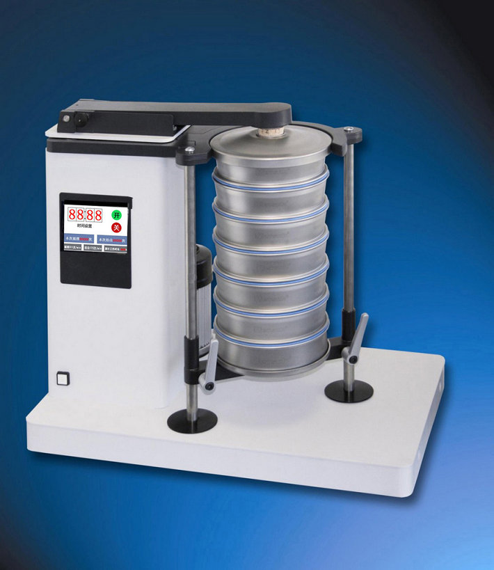 電機帶動齒輪通過同步帶傳動到主軸上,經(jīng)齒輪變速后主軸按要求的轉(zhuǎn)速轉(zhuǎn)動,主軸帶動偏心輪使滑板做往復(fù)運動,帶動安裝在滑板托盤中的試驗篩左右搖動,同時主軸帶動頂桿齒輪轉(zhuǎn)動,變速后頂桿齒輪通過凸輪頂擊頂桿,頂桿使拍錘上下拍擊試驗篩上蓋,使得試驗篩、分樣篩中的物料往復(fù)和上下振動,使小于試驗篩的篩面網(wǎng)孔的物料顆粒篩分進下層試驗篩,如此層層篩選,使每層試驗篩內(nèi)只留相同粒度的物料。達到不同粒度的分離并確定此物料的粒度組成。
